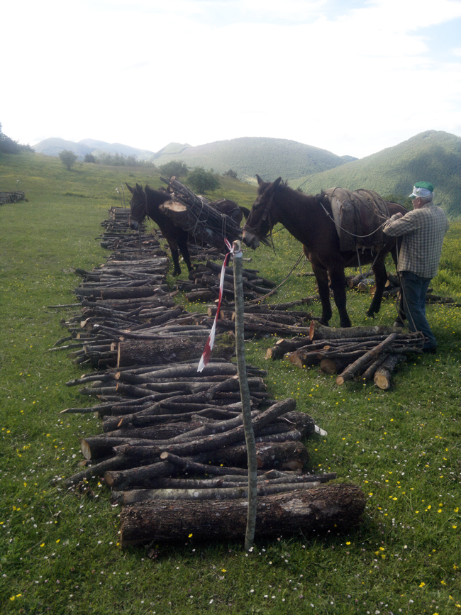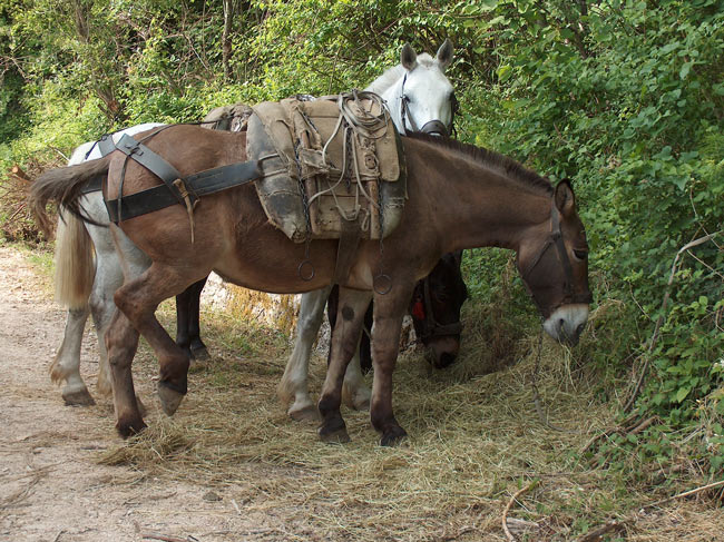 Muli per il trasporto della legna a C. Aiale sulle Serre (Cantiano), giugno 2005