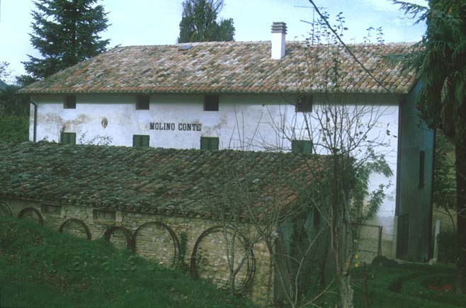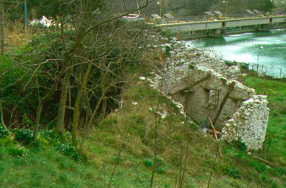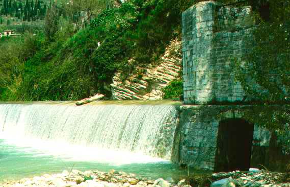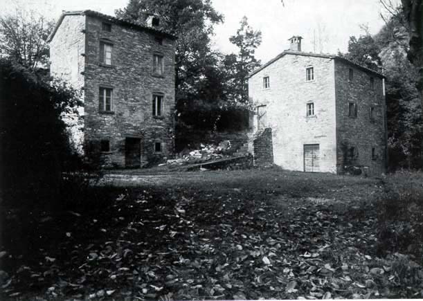 Mulini dell'Acquasanta: mulino inferiore, con a sinistra il bottaccio e a destra la diga e l'invaso di San Lazzaro, marzo 1998