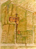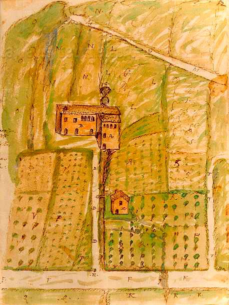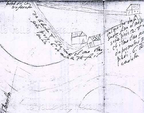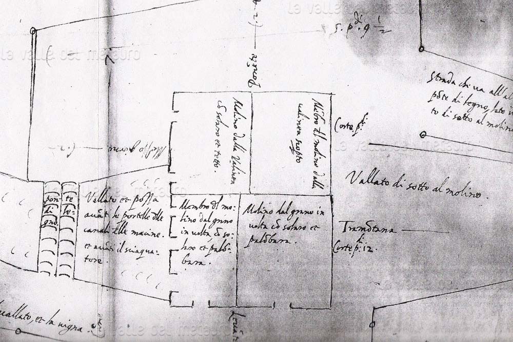 Mulini dell'Acquasanta, disegno della cartiera (volume manoscritto n° 35, Archivio Vescovile di Fossombrone, che ha per titolo: Processus inter DD. De Passio.is et D.m Rodulphum super Cartaria Aquae Sanctae). L'edificio indicato con la lettera A corrisponde alla Cartara Fabricata sopra il corso d'acqua; con la lettera B si intende Cartara fondata in secolo emph.o; la C indica la fonte del acqua di acqua santa; la D è la strada che va alla Cartara et a Casa Ridolfi; la E il termine ch'era tra Passionei e il Ridolfi; la L Selva del Ridolfi; la X Casa del Ridolfi; la F la strada Flaminia; la P vigna de Passionei et Caneto; la J pozze da lino