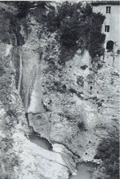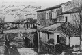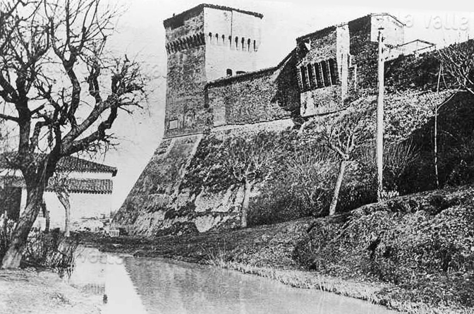 Mulino del Porto (probabilmente l'edificio sulla sinistra) e Rocca Malatestiana a Fano (foto d'epoca). In primo piano él valat, il canale che partendo dal vallato del Porto alimentava i tre mulini urbani