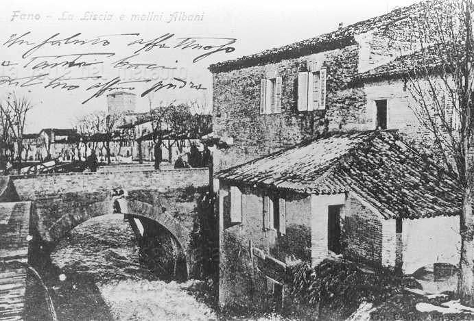 Mulino della Liscia o Fabbrica del Tabacco (cartolina d'epoca). Nella didascalia della cartolina è scritto "Fano - La Liscia e molini Albani"
