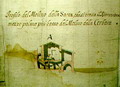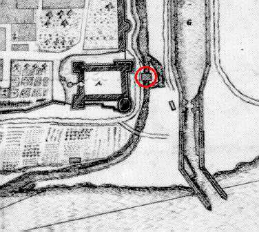 Mulino della Rocca (Giovanni Giorgi, Pianta in piano di Fano, 1658). Il mulino della Rocca è alimentato da un canale che lambisce le mura e si scarica in mare; sono visibili la Rocca Malatestiana e il Porto Borghese (da PANICALI e BATTISTELLI 1977)