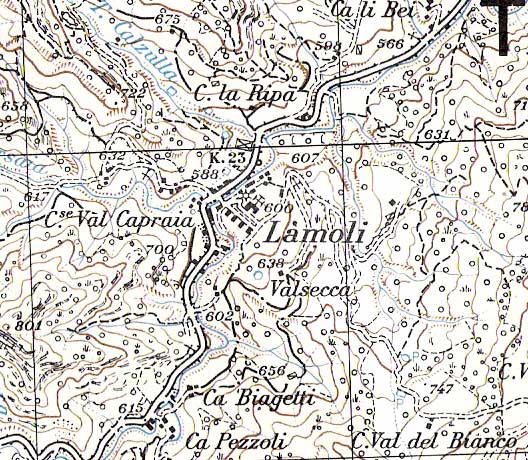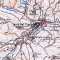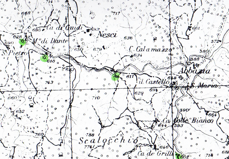 Mulino di Dante, due Mulini a Monte di Abbazia e Mulino di Ca de' Grilli, Comune di Città di Castello. Carta IGM 1:25.000 115 I N.E., modificata (autorizz. IGM n. 4877 del 2-11-1998)