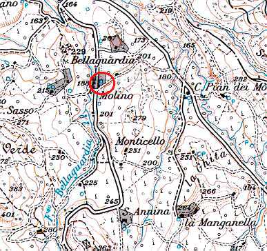 Mulino di Bellaguardia. Carta top. Reg. Marche 1:25.000 109 II (autorizz. Ufficio Cartografia e Inform. Territoriali Reg. Marche del 13-3-1999 e aut. IGM n. 4877 del 2-11-1998)