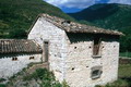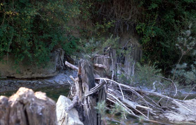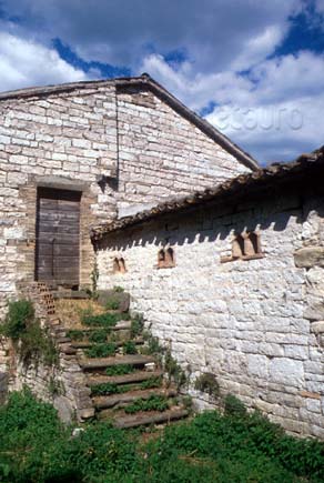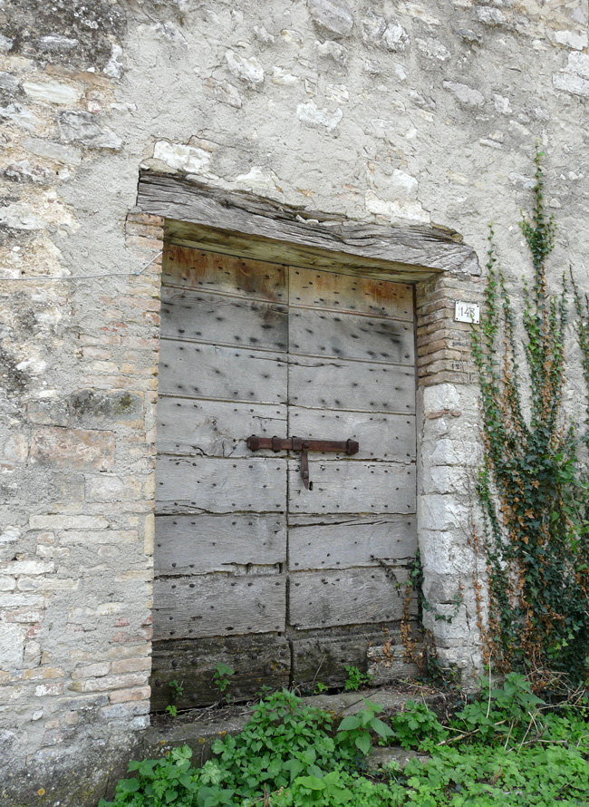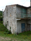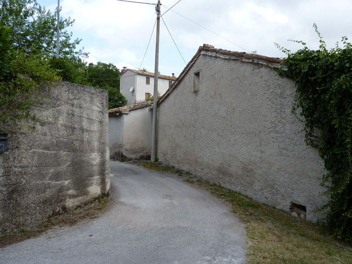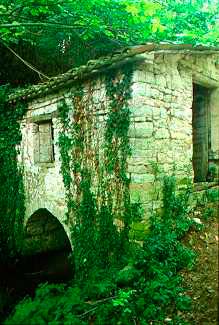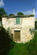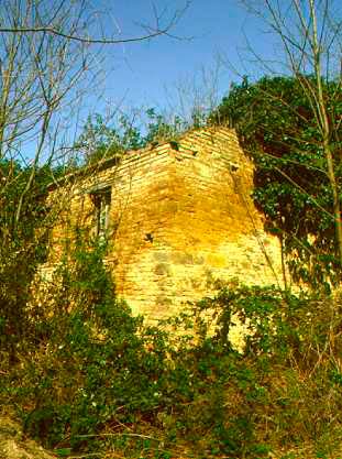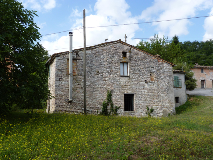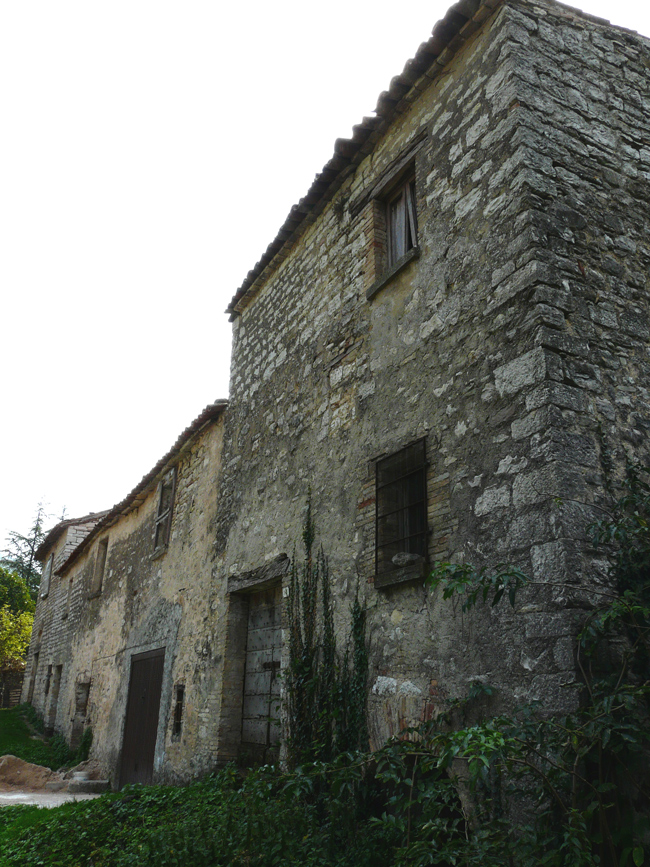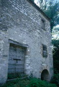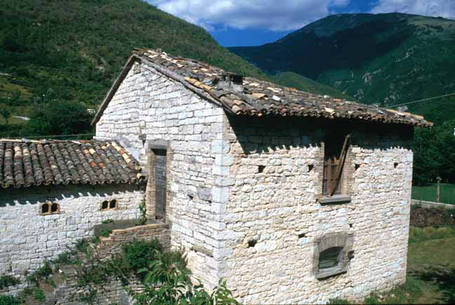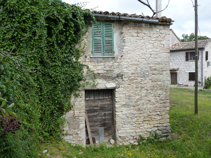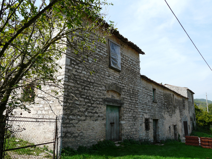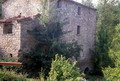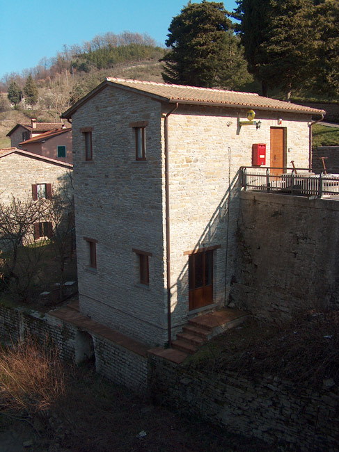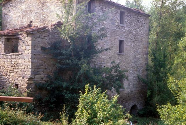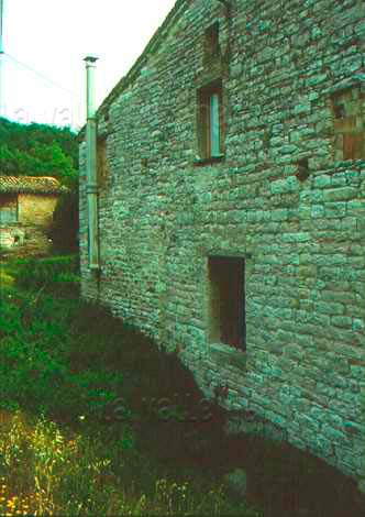 Mulino di Cartoceto di Pergola. A sinistra il muro di contenimento del bottaccio in cemento, staccato dall'edificio del mulino, visibile sulla destra