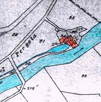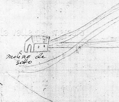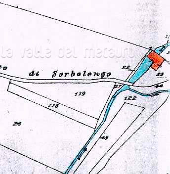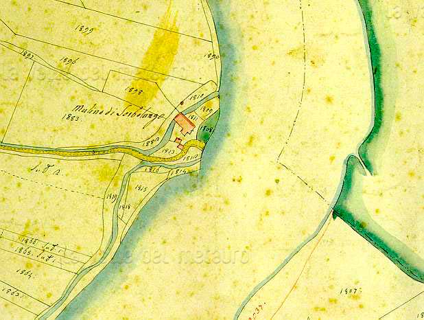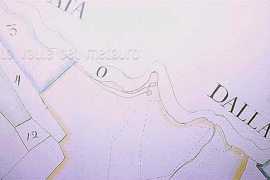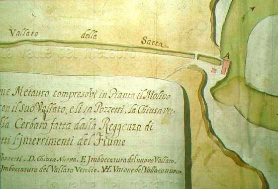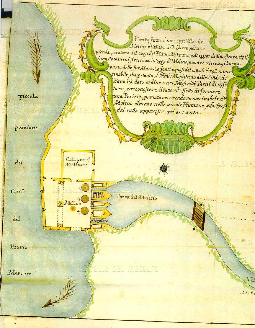 Mulino e vallato della Sacca (mappa del XVIII sec.). Biblioteca Federiciana, Fano, Sala Manoscritti, Disegni, B 3 -99.