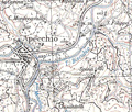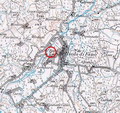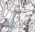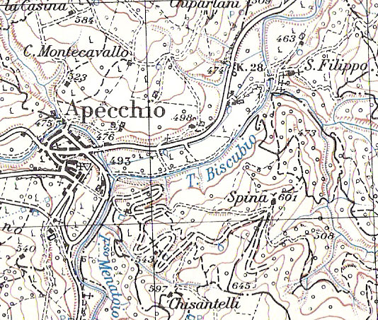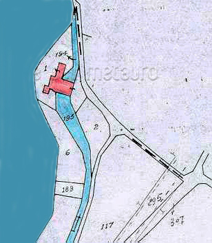 Mulino Mancino. Carta top. IGM 115 I S.E. (aut. IGM n. 4877 del 2-11-1998). Sono rappresentati (in blu) il canale di alimentazione, il bottaccio e il canale di scarico