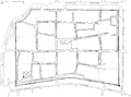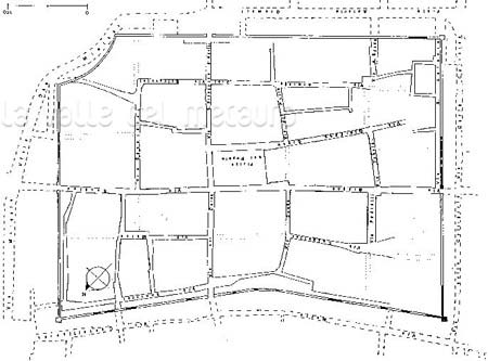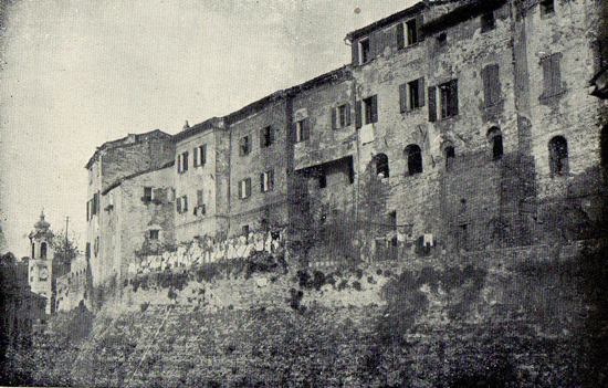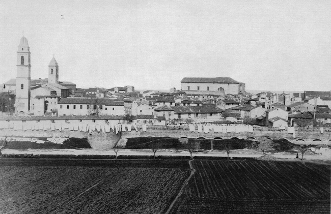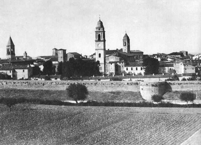 Mura Malatestiane a Fano, fine del 1800 (da AMADUZZI 1984). Nei campi davanti le mura saranno poi ubicati il Foro Boario e la Caserma Francesco Palazzi (poi chiamata Caserma Paolini)