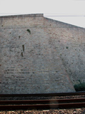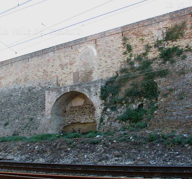 Mura Malatestiane a Fano, lato verso il mare e la ferrovia, agosto 2007. E' visibile in alto un arco tamponato e al di sotto i resti di (?) una torre di guardia