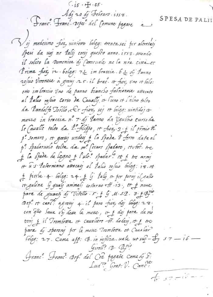 Nota per le spese del Palio nella domenica di Carnevale 1558
