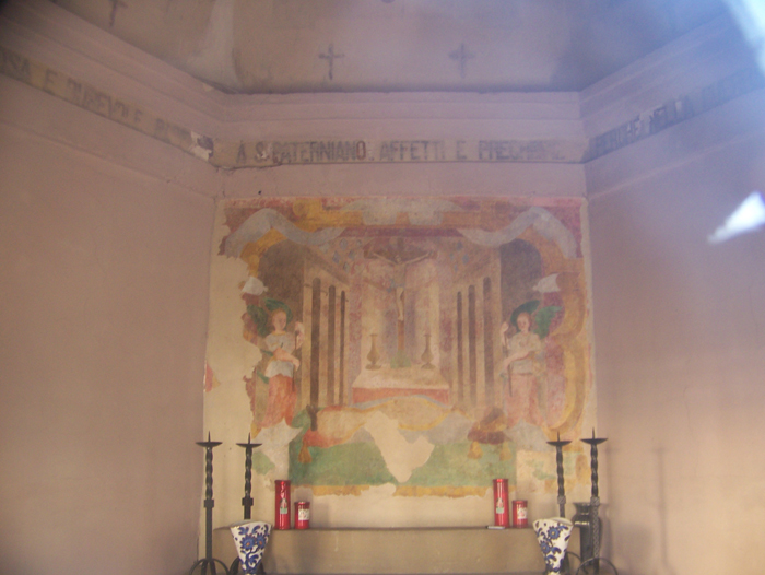 Oratorio di San Martino a Fano. Affresco che rappresenta Cristo in Croce con gli angeli che vegliano la salma di un vescovo, probabilmente S. Paterniano, databile sulla fine del XVI secolo