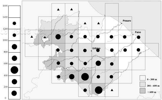 Orbettino - Carta di distribuzione in Provincia di Pesaro e Urbino, 2002. Legenda: cerchio grande = 7 e più rilevazioni dal 1980; cerchio medio = 4-6 rilevazioni; cerchio piccolo = 1-3 rilevazioni; quadrato = dato anteriore al 1980; triangolo = dato fuori dei confini della Provincia. Nel grafico altitudinale: cerchio grande = 15 e più rilevazioni; cerchio medio = 5-14 rilevazioni; cerchio piccolo = 1-4 rilevazioni. Ulteriori notizie nella scheda: Come leggere le schede dei Rettili