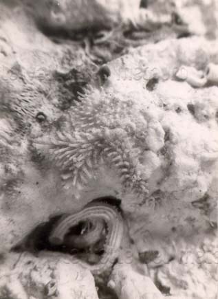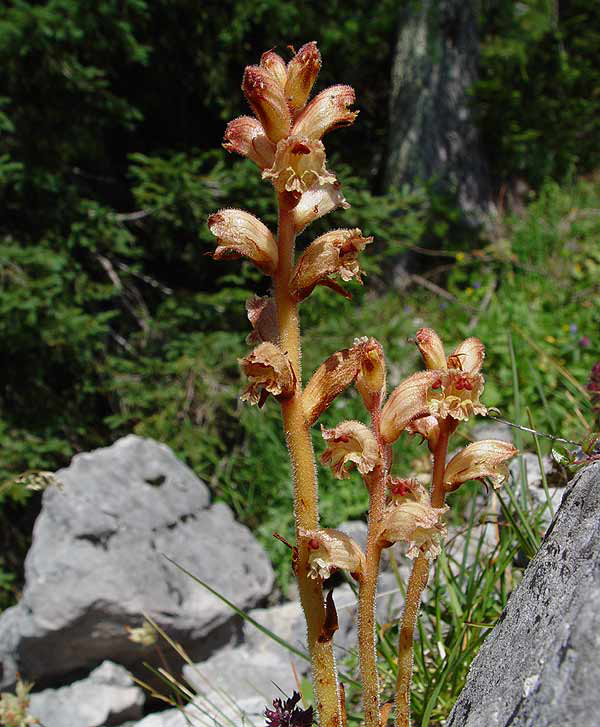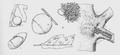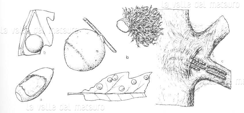 Organismi che si cibano di parti di Quercus pubescens. Legenda: (a) Ghianda rosicchiata da un Roditore; (b) Varie galle; (c) Nido dei bruchi della farfalla notturna Processionaria della quercia (Thaumetopoea processionea L.)