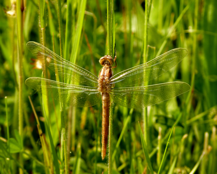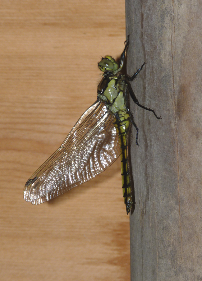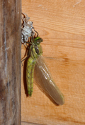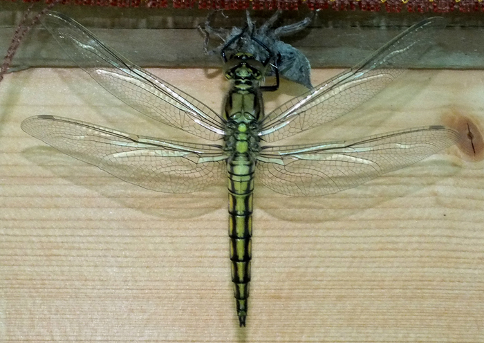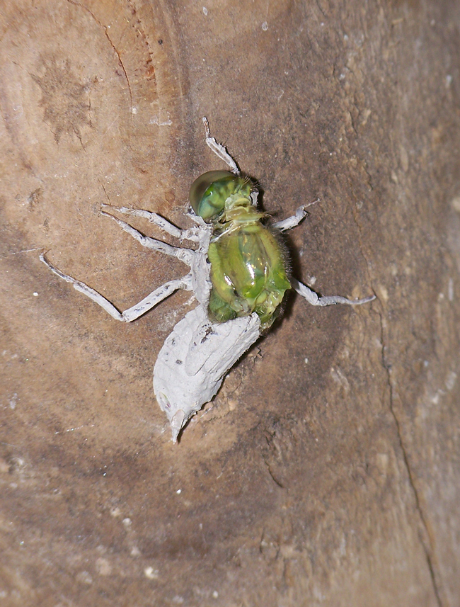 Orthetrum cancellatum che sta uscendo dall'esuvia, Lago Vicini lungo il F. Metauro a Fano, aprile 2011