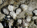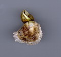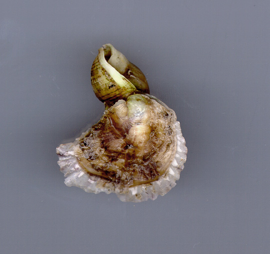 Ostrea edulis di 35 mm attaccata a Nassarius mutabilis, spiaggiata a Fano, dicembre 2001