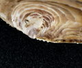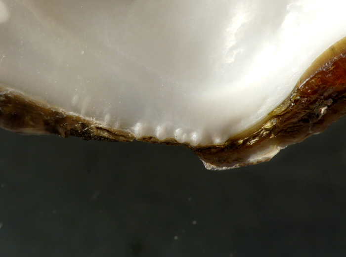 Ostrea edulis di 60 mm, dentini presso l'umbone della valva destra, spiaggiata a Fano, dicembre 2001
