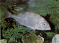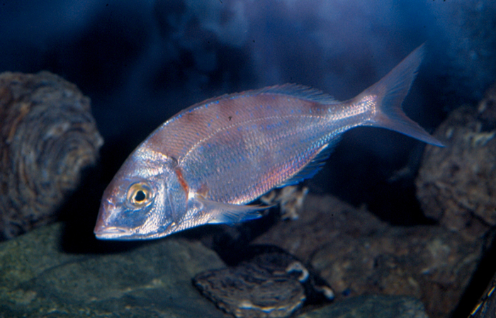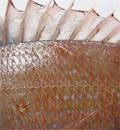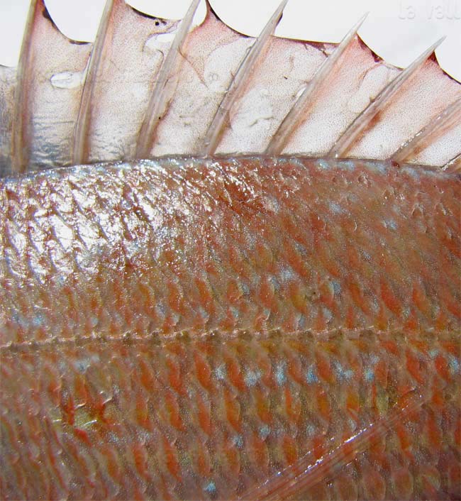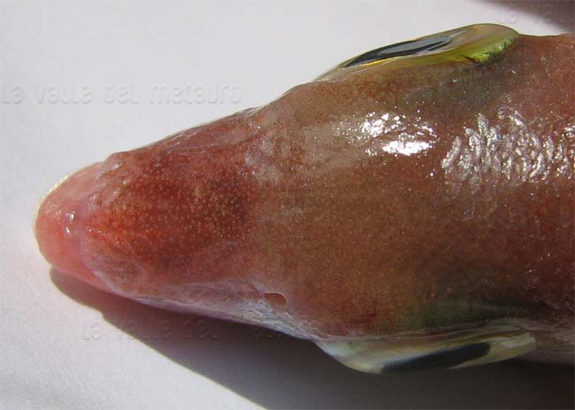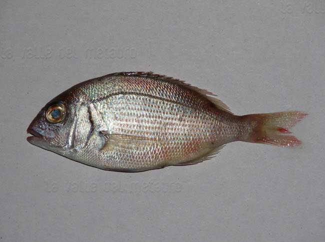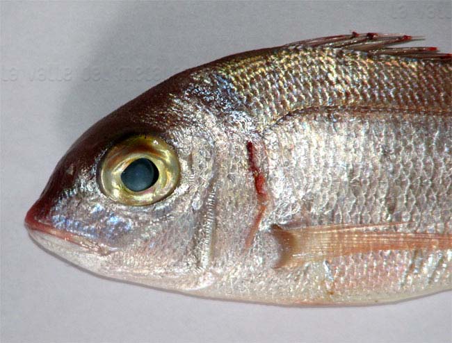 Pagello fragolino di 15 cm, particolare della parte superiore della testa. Pescherie di Fano, giugno 2006