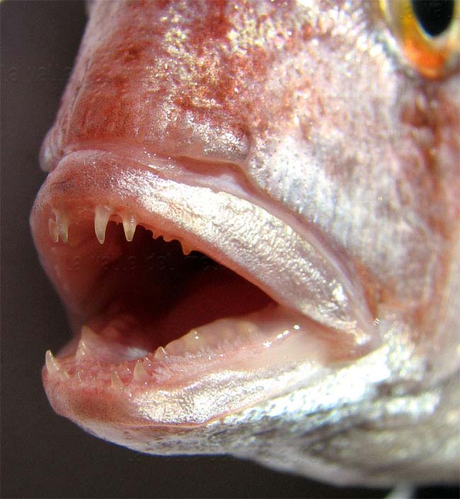 Pagello fragolino di 15 cm, particolare della bocca. Pescherie di Fano, giugno 2006