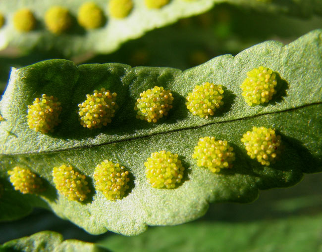 Pagina inferiore di una fronda di Polypodium cambricum con sporangi raggruppati in sori, Orto botanico di Casa Archilei a Fano, dicembre 2007