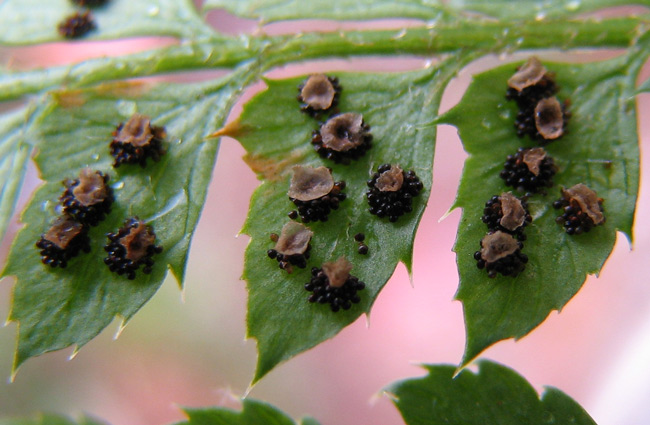 Pagina inferiore di una fronda di Polystichum setiferum con sporangi raggruppati in sori, Orto botanico di Casa Archilei a Fano, dicembre 2007