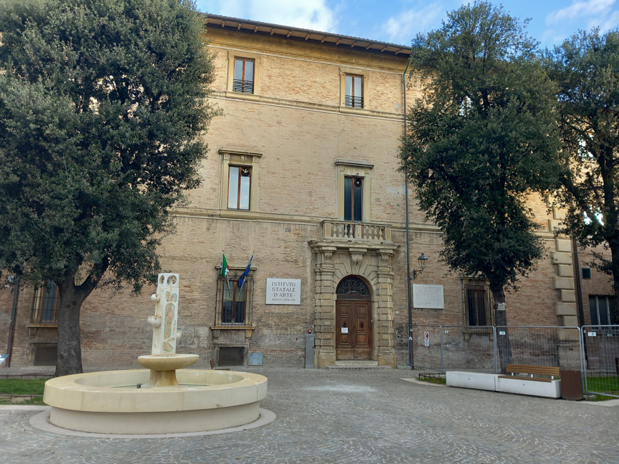 Palazzo Marcolini nella piazza omonima, aprile 2025. L'arredo della piazzetta è stato di recente rinnovato, con l'aggiunta della fontana prima posta nei Giardini Amiani ed ora restaurata