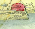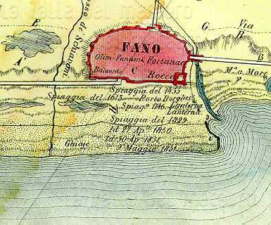 Avanzamento della spiaggia a Fano dal 1435 al 1851, con raffigurati il Porto di Fano e le mura cittadine (dis. De Cuppis 1866)
