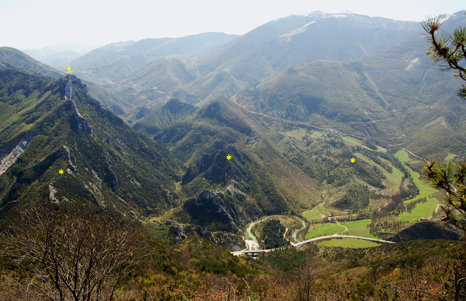 Panoramica sul versante destro della valle del Candigliano, all’altezza della terminazione sud-occidentale della gola di Gorgo a Cerbara; in evidenza creste di faglia su Maiolica (freccia) e dorsali omoclinali (asterischi), aprile 2007
