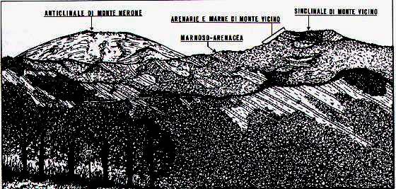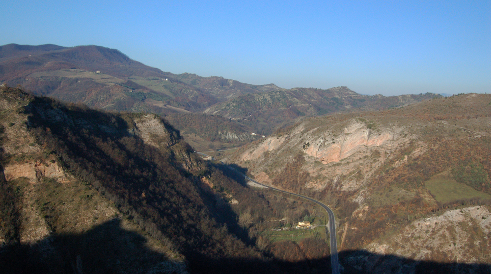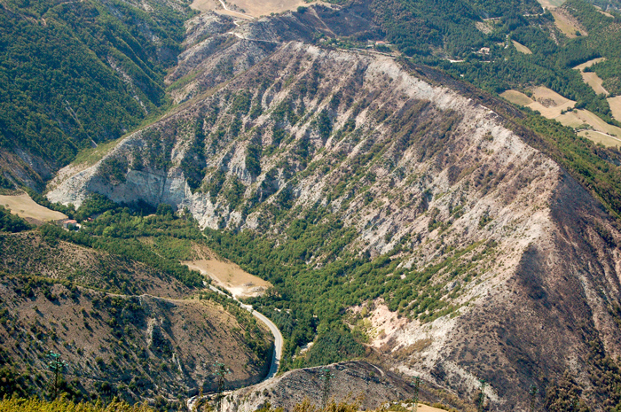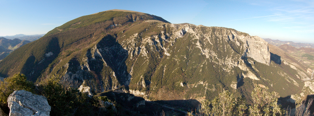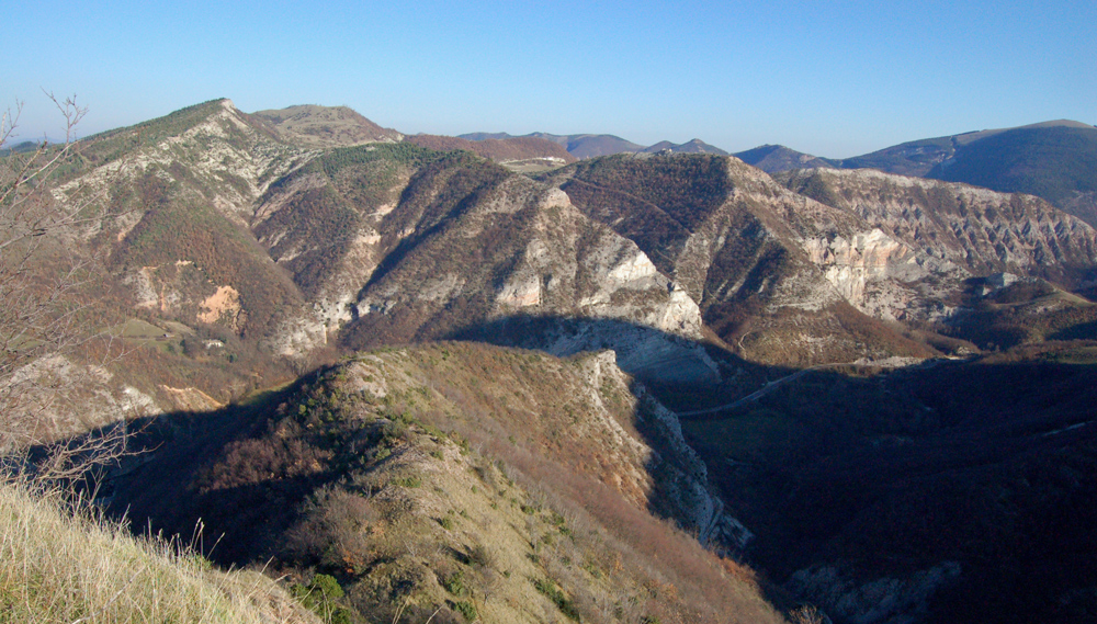 Panoramica su Monte di Montiego e sulla Gola di Gorgo a Cerbara; in evidenza la curvatura dei corpi rocciosi che sottolinea l’assetto anticlinalico della dorsale attraverso la quale si sviluppa la Gola, gennaio 2007