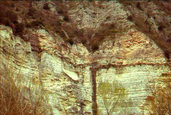 Panoramica sulla Gola del Biscubio; si può cogliere la blanda arcuatura dei corpi rocciosi che sottolinea l’assetto anticlinalico della struttura attraversata dalla gola, dicembre 2006