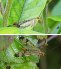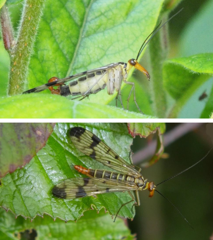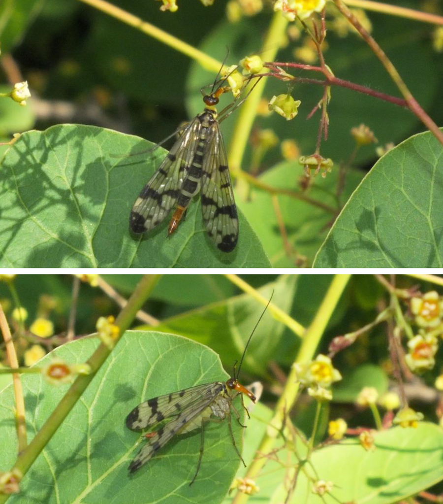 Panorpa gr. cognata maschio, area verde di Casa Archilei alla periferia di Fano, maggio 2023 (foto L. Poggiani); in basso: femmina, F. Metauro a Fano, settembre 2015 (foto V. Dionisi)