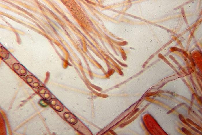 Parafisi settate, lisce, con apice clavato di Humaria hemisphaerica, Fontecorniale (Montefelcino), ottobre 2017