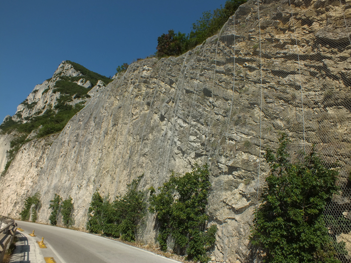 Parete rocciosa appianata artificialmente nel tratto di Flaminia a valle della Galleria del Furlo, aprile 2012