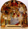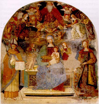 Parete destra della navata: Madonna con Bambino, Santa Caterina e Ludovico d'Angiò; il Padre eterno fra Angeli e Serafini. Affresco di Scuola umbra del Quattrocento
