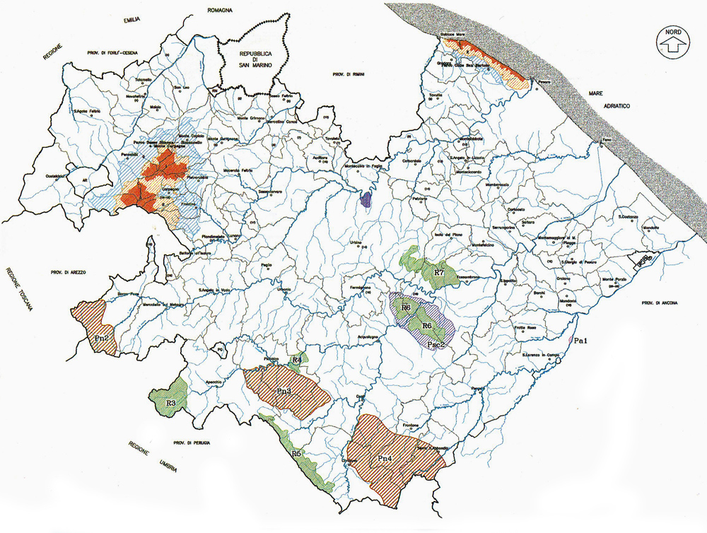 Legenda: per i Parchi naturali regionali del Monte San Bartolo e del Sasso di Simone e M. Simoncello (istituiti con L. R. 15/94) in arancio l'ambito interno, in barrato arancio l'ambito periferico e in barrato azzurro l'area contigua; in barrato rosso i parchi naturali (Pn) previsti dal PPAR, in barrato verde le riserve naturali (R) previste dal PPAR, in barrato viola il parco storico culturale (Psc2) previsto dal PPAR per i Monti del Furlo; in viola le Zone umide del PPAR (La Badia presso Schieti)