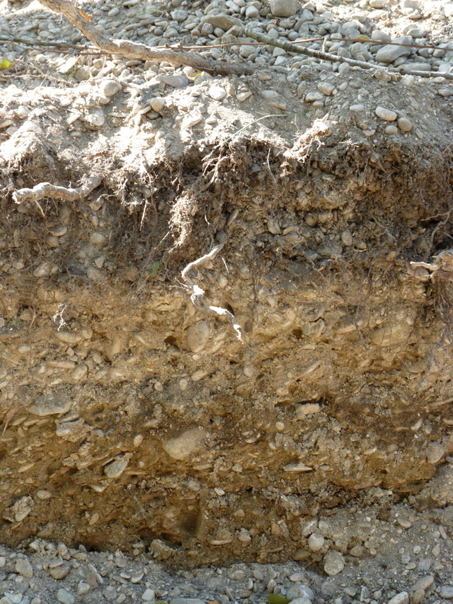 Parete di scavo di 1 metro che mostra strati ghiaiosi, Lago Vicini lungo il F. Metauro a Fano, giugno 2011
