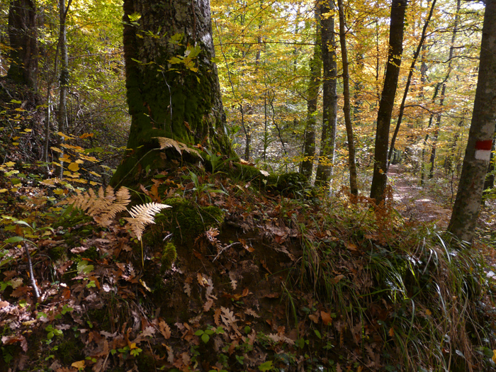 Parete lungo la Flaminia prima della Galleria di Vespasiano al Furlo, giugno 2012. Passaggio dalla Formazione della Corniola (a destra, stratificata) al sottostante Calcare Massiccio