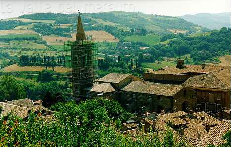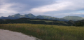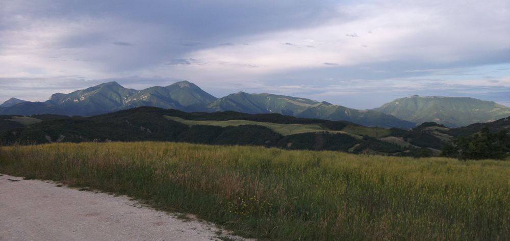 Parte della Dorsale Umbro-Marchigiana con i monti Catria-Acuto, Tenetra-Campifobio e sulla destra il Petrano, visti da NE, maggio 2010. I rilievi piů bassi e vicini sono quelli della zona di M. Martello (Comune di Cagli); in primo piano la zona sommitale del M. Varco