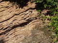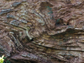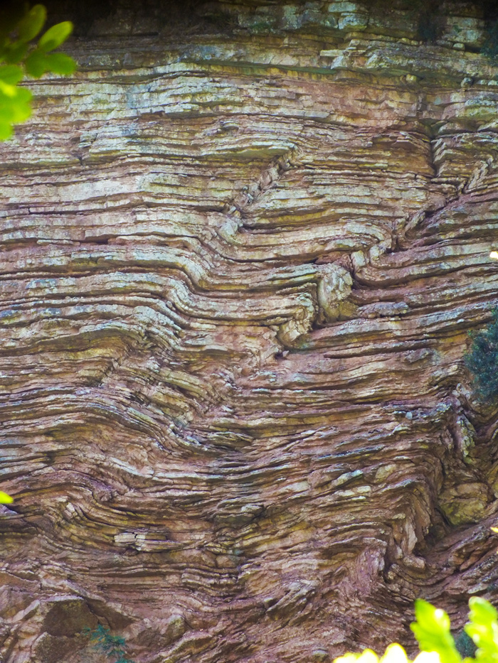 Particolare della parete in ombra: deformazioni sinsedimentarie (orizzonti a slump) nella formazione del Bosso, loc. Eremita, giugno 2012