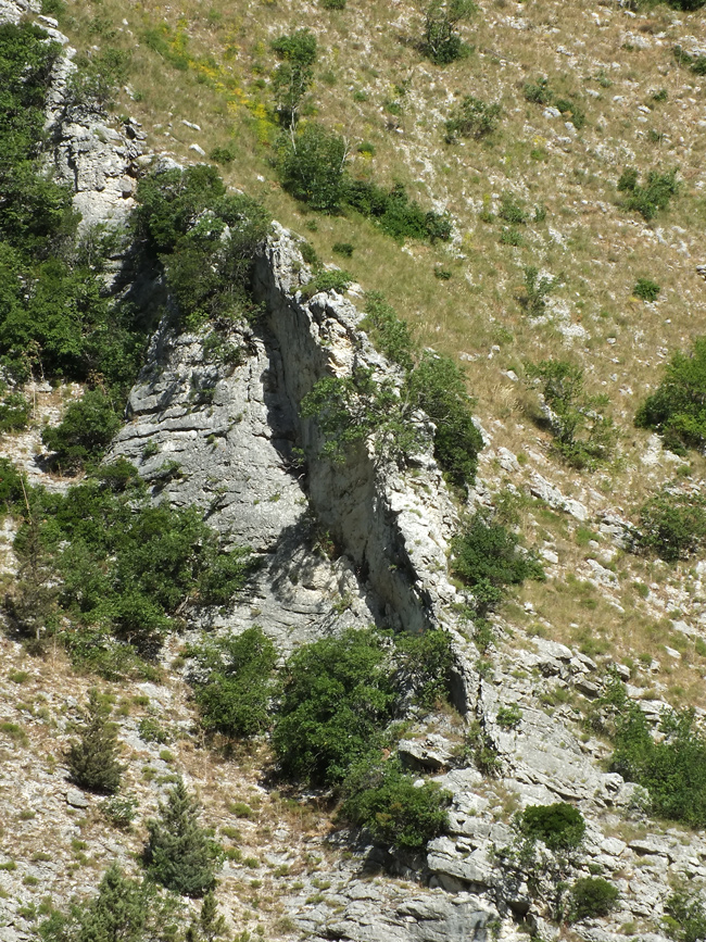 Particolare della cresta su faglia dell’immagine precedente: in evidenza il piano di faglia; Maiolica in loc. Palirosa, destra idrografica della Gola del Biscubio, giugno 2012