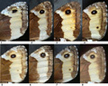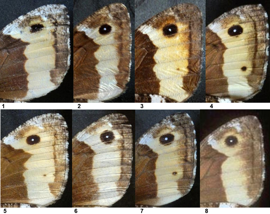 Parte inferiore dell’ala anteriore di Hipparchia, per mostrare la forma del contorno prossimale della fascia postdiscale chiara. Si riporta la misura dell’ala anteriore. 1 - H. fagi 35 mm, M. Tenetra. 2 - H. fagi 35 mm, M. Catria. 3 - H. fagi 34 mm, M. Petrano. 4 - ? H. fagi/hermione 32 mm, M. Nerone. 5 - ? H. fagi/hermione 34 mm, M. Petrano. 6 - H. hermione 32 mm, M. Tenetra. 7 - H. hermione 31 mm, M. Acuto (foto L. Poggiani). 8 - H. hermione maschio (foto R. Villa, da: VILLA et al., 2001, modif.)