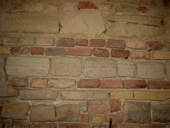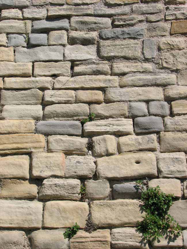 Particolare dei blocchetti di arenaria usati nella mura di Sant'Ippolito, agosto 2007