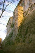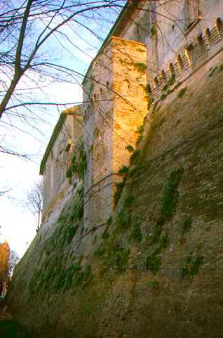 Particolare della cinta muraria di San Giorgio di Pesaro. E' visibile la postazione rompitratta di difesa, il muro a scarpa e il sovrastante parapetto su beccatelli ciechi