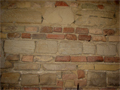 Particolare della muratura con alternate file di pietra arenaria e di mattoni, Casa Archilei, Fano