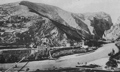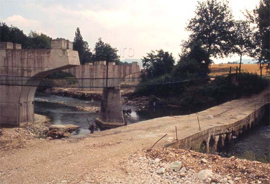 Passerella di Camponero con a fianco il ponte sul Metauro in costruzione e un attraversamento provvisorio, luglio 1984