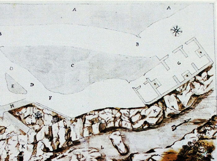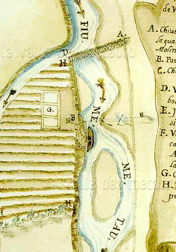 Passo della barca di Montemaggiore (mappa del 1738). Con "G" è indicata la casa del barcarolo della Cerbara (Sezione Archivio di Stato di Fano, Ufficio Capitano dei Mulini, busta n. 8)