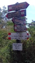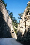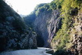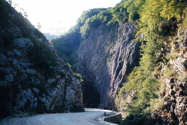 Passo del Furlo, con Chiesa di S. Maria delle Grazie (G), Galleria di Vespasiano (B), Galleria minore (D), tratto abbandonato di Flaminia (F), F. Candigliano (L) (da antica stampa)