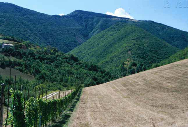Pendici nei dintorni di Pieve dei Graticcioli e sullo sfondo il Monte Vicino, luglio 2000