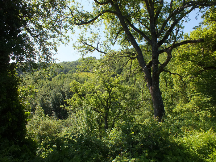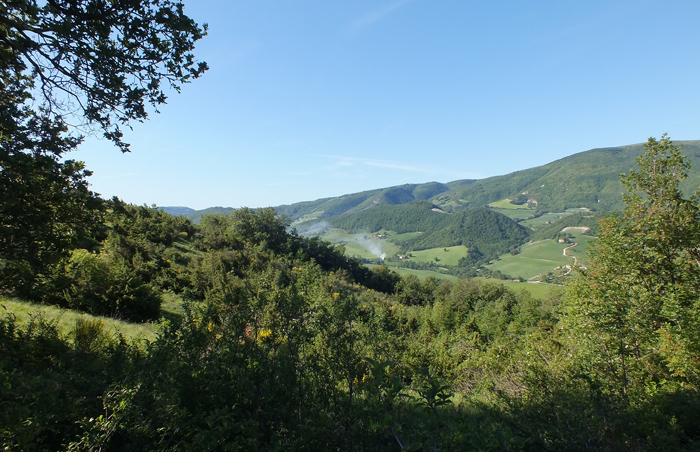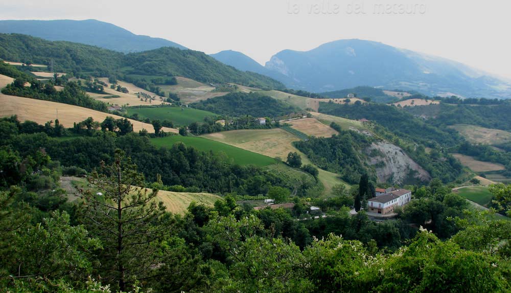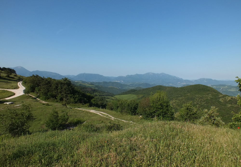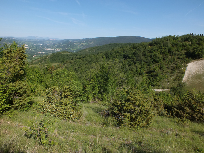 Pendici di S.O. del rilievo M. Raggio-Montalto Tarugo, maggio 2012. Sullo sfondo la valle del Metauro nella zona di Canavaccio e i Monti della Cesana