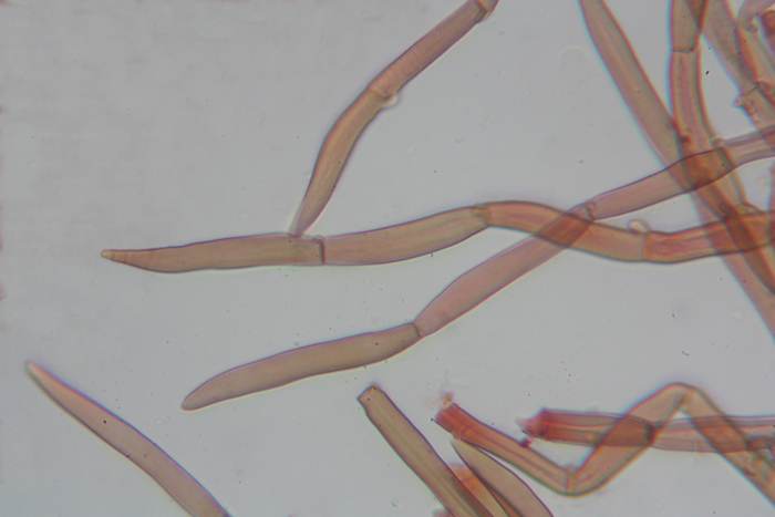 Peli settati, a pareti sottili, appuntiti, con giunti a fibbia di Phaeomarasmius erinaceus, Montalto Tarugo, ottobre 2018