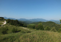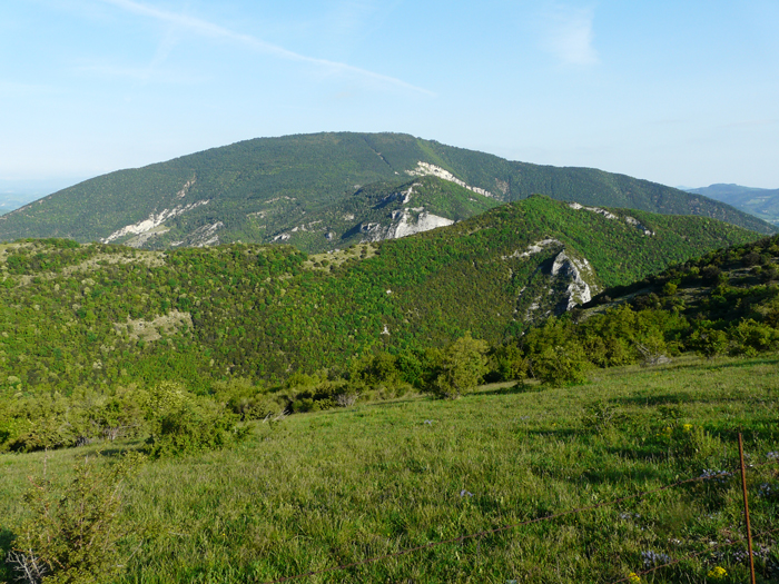 Pendici verso S.O. del M. Paganuccio (Monti del Furlo) viste da Casa S. Ubaldo, maggio 2012. Sullo sfondo la Dorsale Umbro-Marchigiana (da destra verso sinistra M. Nerone, M. Petrano e parte del M. Catria)